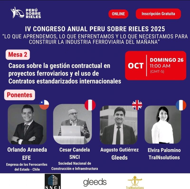 TRAINSOLUTIONS partagera son expertise sur les contrats standardisés (FIDIC, NEC, CCAG), contribuant ainsi à la diffusion des bonnes pratiques et au renforcement de la performance des projets ferroviaires au Pérou.