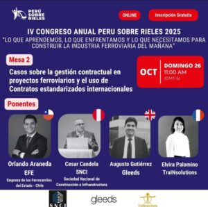 Notre CEO, Madame Elvira Palomino, aura le plaisir d’y intervenir aux côtés de M. Orlando Araneda, PMP®, pour partager son expertise sur la gestion contractuelle préventive, la performance économique des projets et la prévention des litiges dans les grands projets ferroviaires et d’infrastructure complexe.